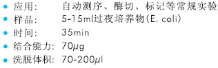 適合于從5-15ml培養(yǎng)過(guò)夜的細(xì)菌培養(yǎng)液中抽提高達(dá)70µg的質(zhì)粒DNA,填補(bǔ)了小量抽提與中量抽提之間的空白。純化的質(zhì)??梢灾苯佑糜谧詣?dòng)測(cè)序、限制性內(nèi)切酶酶切以及PCR 、標(biāo)記以及體外轉(zhuǎn)錄等實(shí)驗(yàn)。