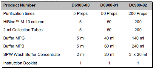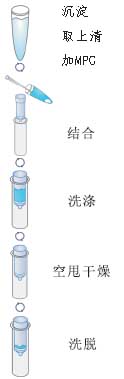 M13噬菌體感染大腸桿菌培養(yǎng)液,離心去除細(xì)菌,加入MPG沉淀M-13噬菌體,上柱過濾吸附收集M13噬菌體,加入Buffer MPX裂解噬菌體,吸附單鏈DNA;加入Wash Buffer洗滌去除雜質(zhì),最后用Elution Buffer洗脫DNA。